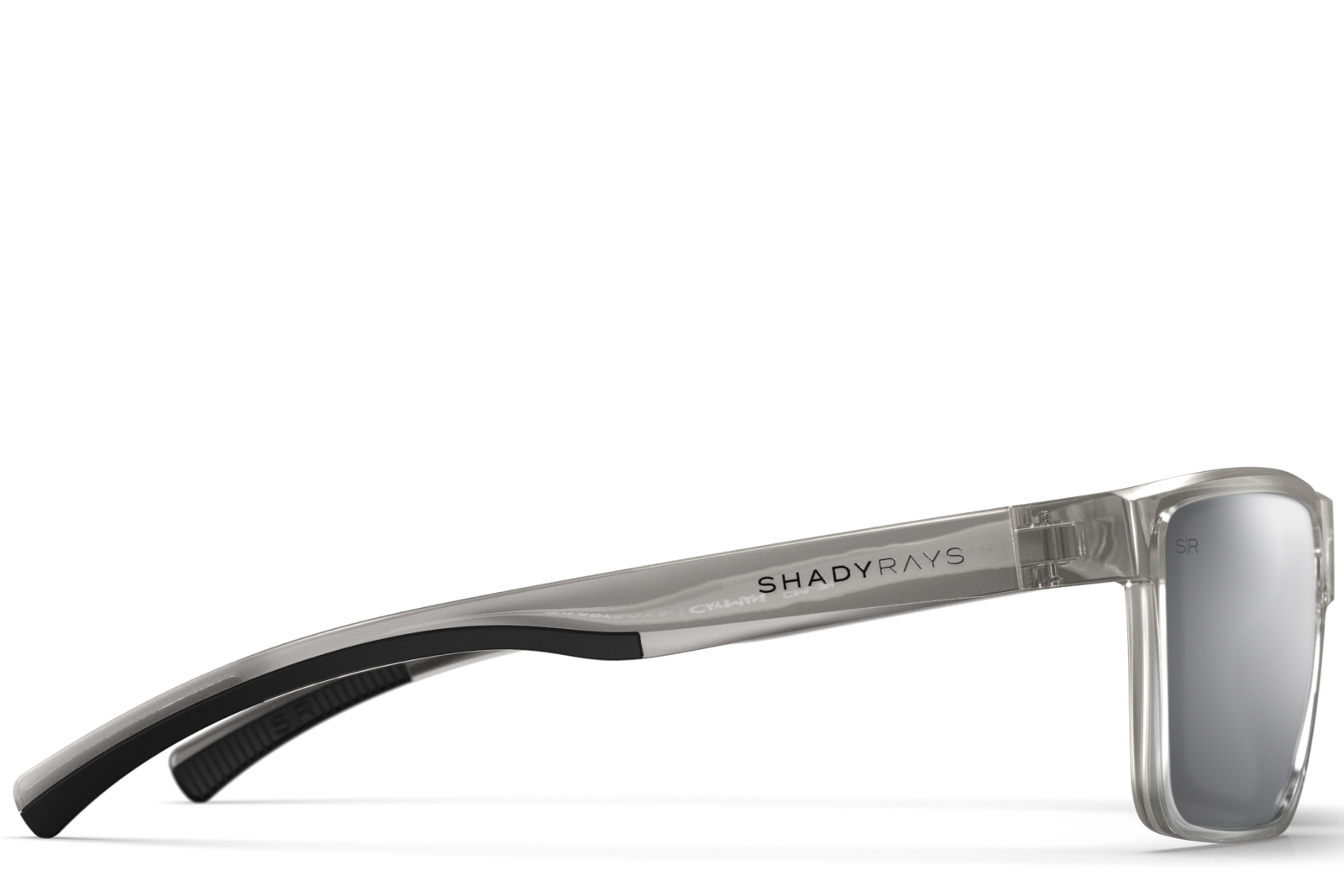 Gloss transparent smoke grey TR-90 frame with raised logos.