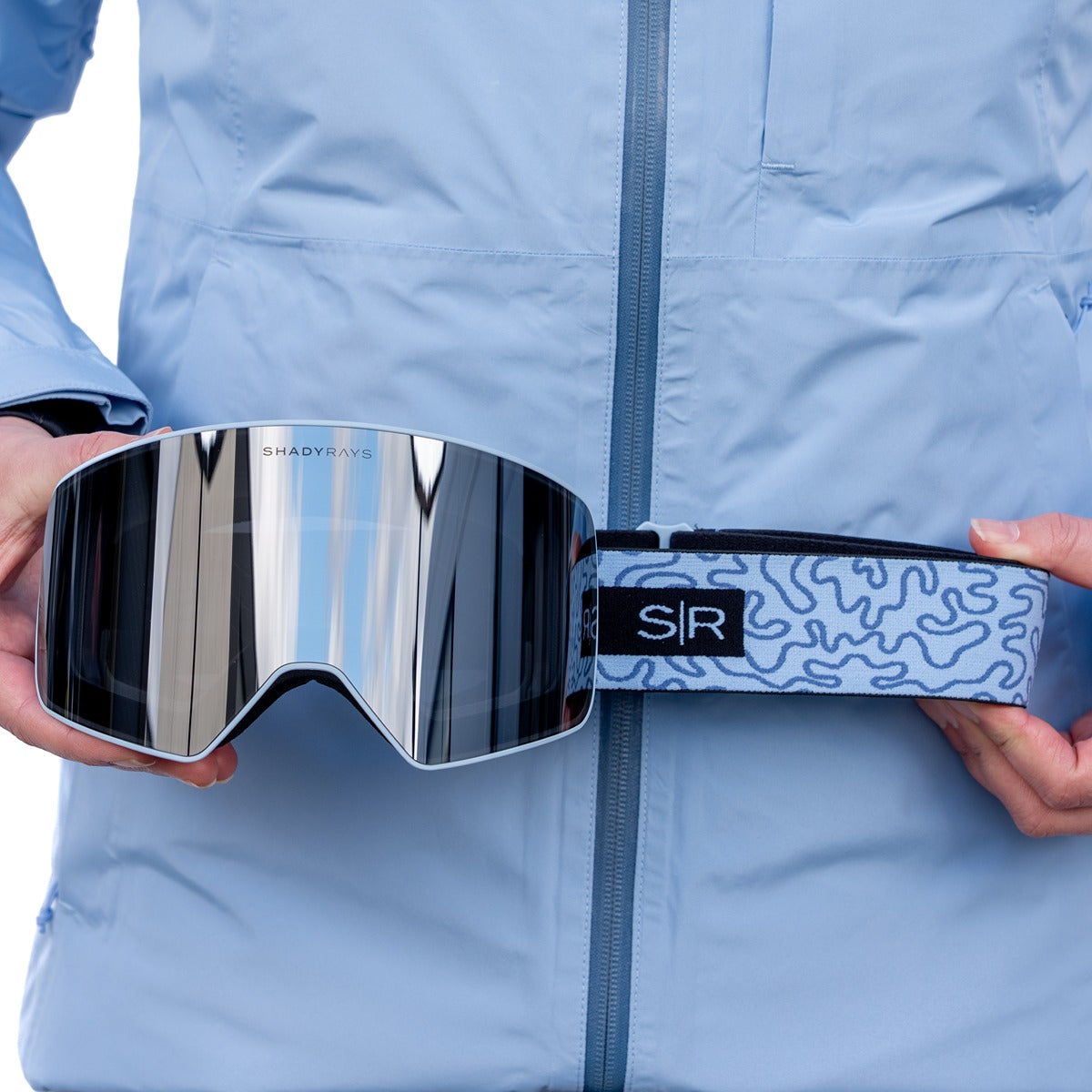 It features our magnetic Frontier mask in matte blue. The premium Chrome lens (PC, 13% VLT) delivers superior clarity and protection in high light. The coordinating strap completes the look with its distinct logo. Keep your gear organized in the soft storage pouch and safeguard your lens on the slopes with the plush microfiber sock.