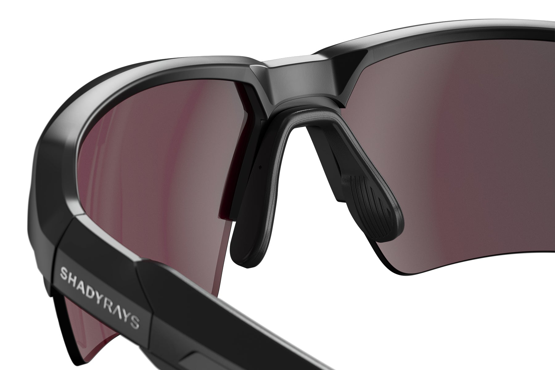 No-slip fit- rubber adjustable nose pads with air flow sweat channels, and dual injected rubber temple tips.
