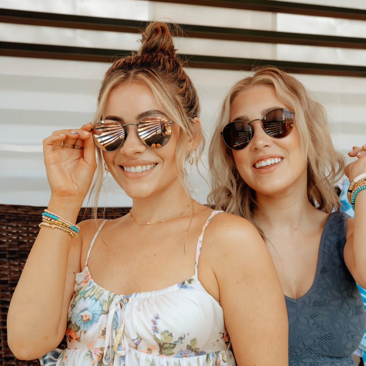 In collaboration with country music stars Maddie & Tae, Tangle Free Aston frames are featured in an antique finish with custom turquoise temples to match the duo’s favorite jewelry